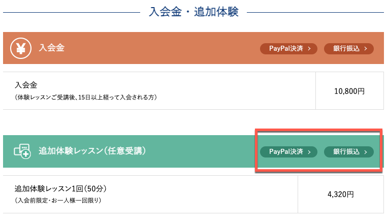 マイページ>PC画面左側「(1)入金・コース変更」ボタン>画面上部「(2)月謝のお支払い」欄の「※追加体験レッスン」ボタン>(該当リストへジャンプ)>(3)「 追加体験レッスン(任意受講)」欄で「PayPal決済」または「銀行振込」ボタンをクリック
