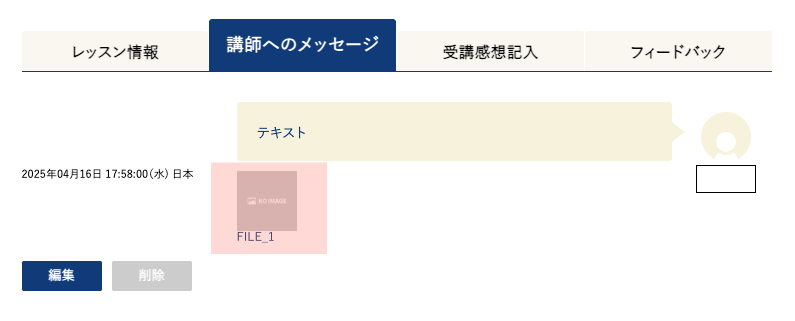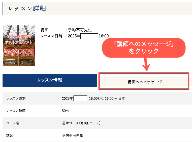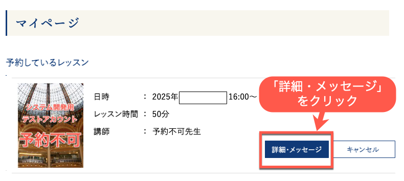 Step 1:マイページより、予約しているレッスンの「詳細・メッセージ」をクリックしてください。