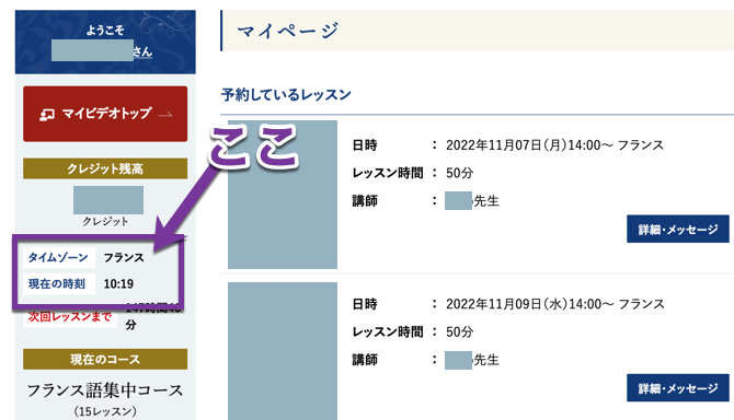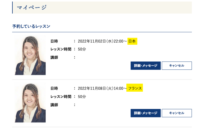 (例3)短期間で日本とフランスを行き来される場合などで、複数の予約を違うタイムゾーンで予約した際、マイページに表示されている予約一覧のレッスン時間は「予約完了時のタイムゾーン」で表示されています。
