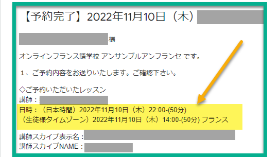 予約システムが自動で設定した夏時間や冬時間に間違いがないか、レッスン予約が確定した後に配信される「【予約完了】メール」において、「◇ご予約いただいたレッスン」欄をしっかりご確認くださいませ。(下記キャプチャ参照)