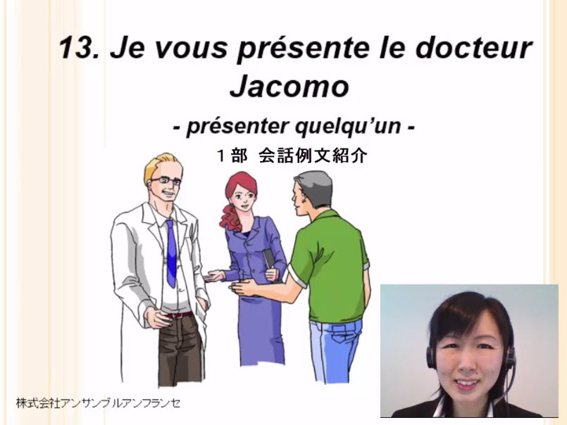 Je vous présente le docteur Jacomo. 相手に第三者を紹介する、または遅刻を詫びるための表現を学びましょう。その際に必要な単語や動詞活用をしっかり覚えましょう。