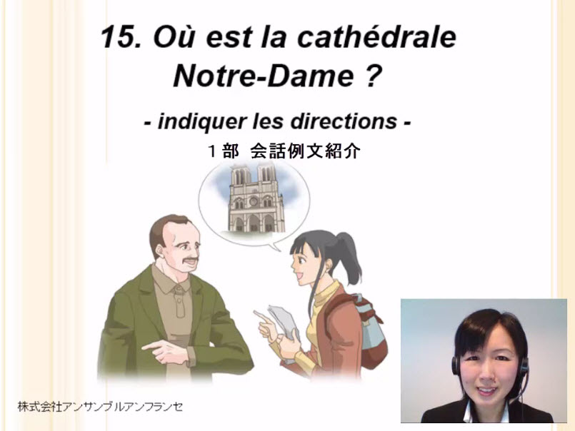 1.フランス語講師が生徒に理解しているか尋ねるところ。2.県庁の職員に探している窓口の場所を尋ねるところ。
