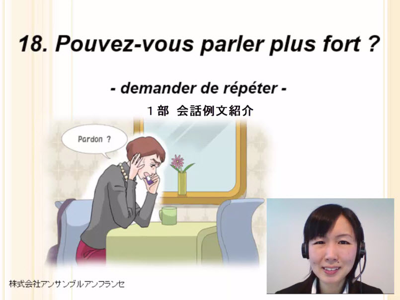 会話、comprendre, répéterの活用、理解を確認する質問と返事、副詞(速く、遅く)、聞き返す言い方、公共交通機関、場所を示す語句、単語、例文、役立つ表現、発音