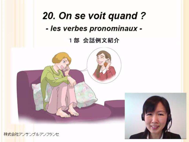会話、代名動詞の形と用法、再帰代名詞、se voir, se laver, s’appeler の活用、préférer, savoirの活用、単語、例文、役立つ表現、発音