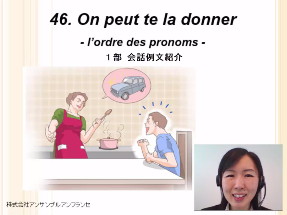 会話、代名詞の順序(1、2人称と3人称、中性代名詞)、文中における代名詞グループの位置、単語、例文、役立つ表現、発音