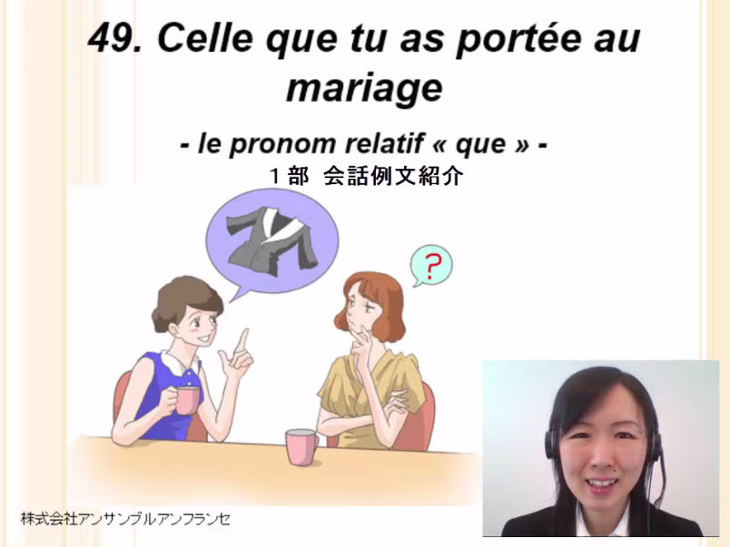 会話、関係代名詞 que の役割と文章構築法、過去分詞の性数一致、単語、例文、役立つ表現、発音