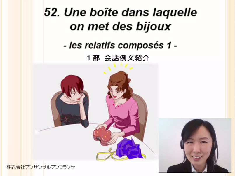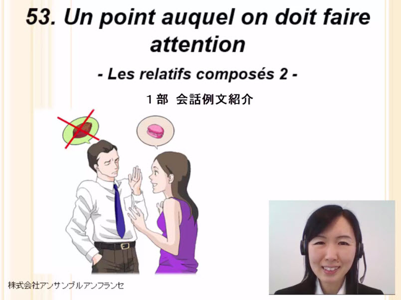 会話、auquel型・duquel型複合関係代名詞の文法構造、文章構築法、注意点(先行詞に人が来る場合)、単語、例文、役立つ表現、発音