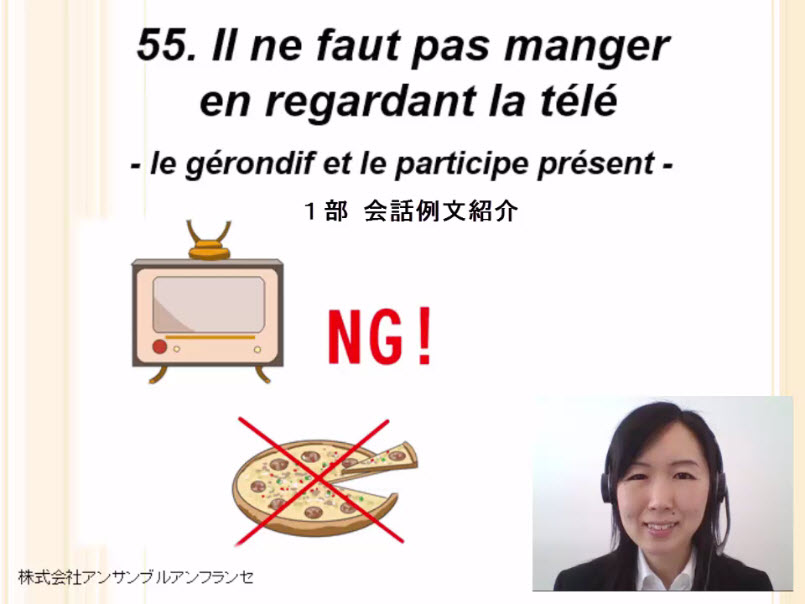Il ne faut pas manger en regardant la télé. ジェロンディフと呼ばれる文法事項と様々な用法を理解し、ジェロンディフに不可欠な「現在分詞」の作り方や単独での用法を学びましょう。