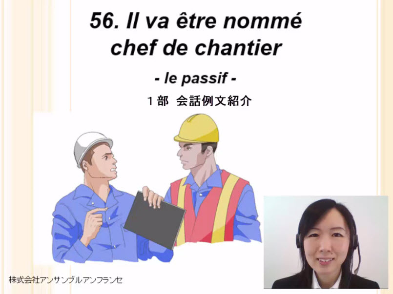 会話、受動態の作り方、過去分詞の性数一致、能動態から受動態への書き換え、注意点(動詞に aimer 等を用いる場合)、単語、例文、役立つ表現、発音