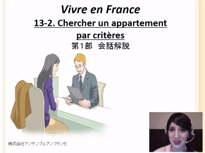 Chercher un appartement par critères. 不動産会社を訪れ、希望の賃貸物件の条件を伝えるまでの会話表現を習得します。